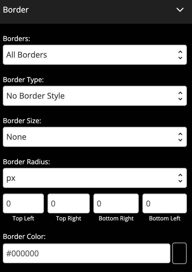 You can add rounded edges to the border by selecting the relevant pixel or percentage width. You may now control each side by entering the number on the Top Left, Top Right, Bottom Right and Bottom Left box. - Border Color