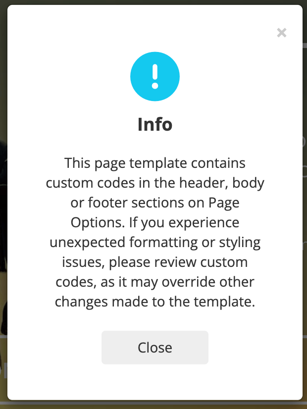 Important: A note or warning will appear on the page templates indicating that a CSS code has been inserted under Page Options > Custom codes.